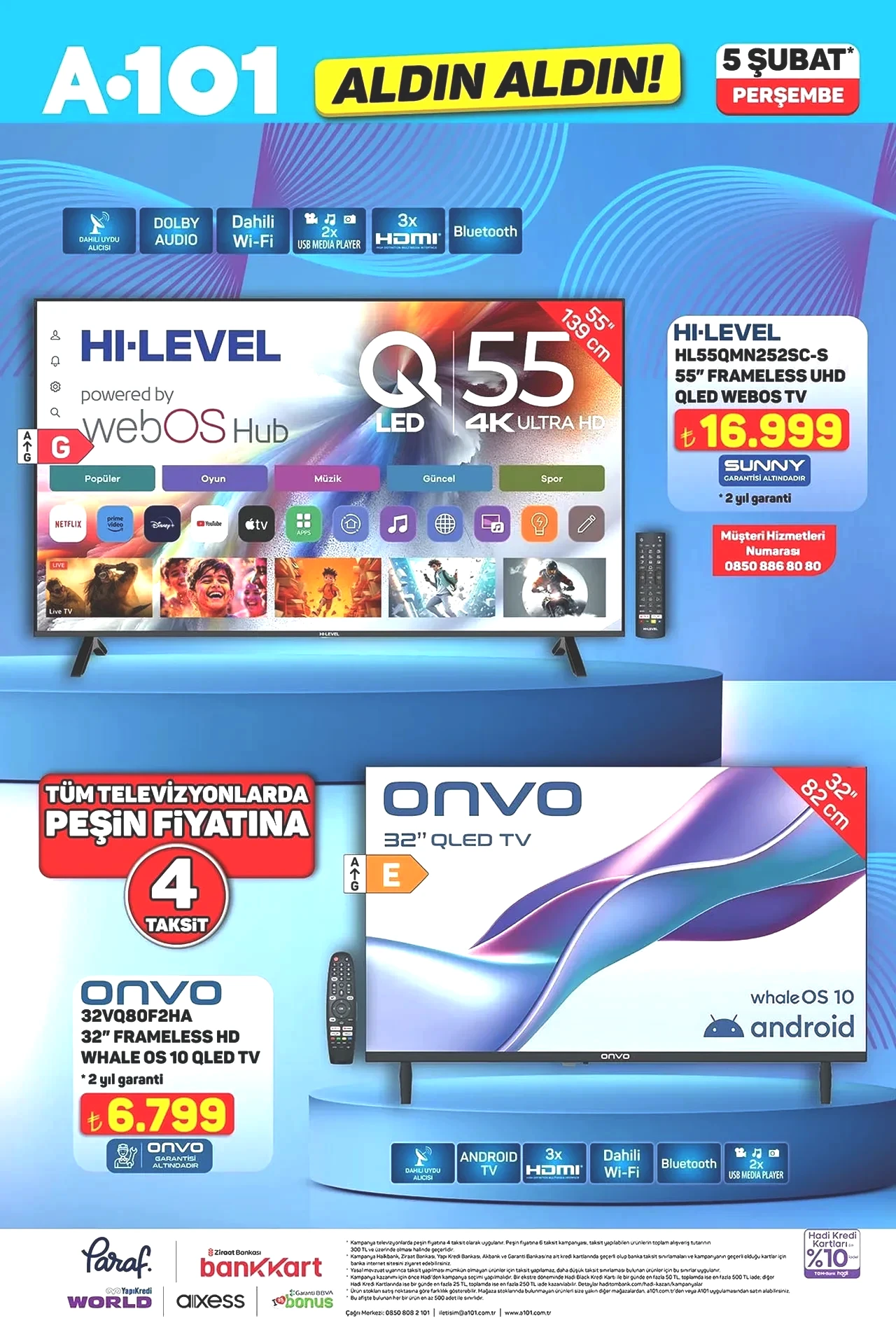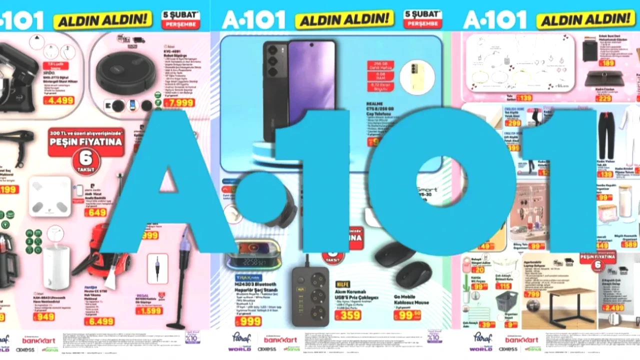 A101'in 5-11 Şubat tarihleri arasında geçerli olan aktüel ürün kataloğu yayımlandı. "Aldın Aldın" kampanyası kapsamında, A101 şubelerine perşembe günü 8 GB RAM ve 256 GB depolama alanına sahip Android 14 işletim sistemiyle donatılmış akıllı telefon getirilecek. Televizyonunu yenilemek isteyenler için, 55 inç QLED altyapısını kullanan bir model 16.999 TL fiyatla satışa çıkacak. Daha uygun fiyat arayışındaki tüketiciler için ise 32 inç boyutundaki QLED televizyon 6.799 TL'ye raflarda yerini alacak. Her iki televizyon modeli de peşin fiyatla 4 taksit imkanı ile sunulacak. Teknolojik ürünlerin yanı sıra, hasır çantalar, kadın cüzdanları, mekanizmalı suni deri erkek cüzdanları, laptop sehpası, iki kapaklı dolap, akıllı baskül, çırpıcılı el blender seti ve çay makinesi gibi ürünler de 5-11 Şubat tarihleri arasında A101 aktüel kataloğunda yer alıyor. Tüm bu ürünlerin listesi açık bir şekilde paylaşıldı.