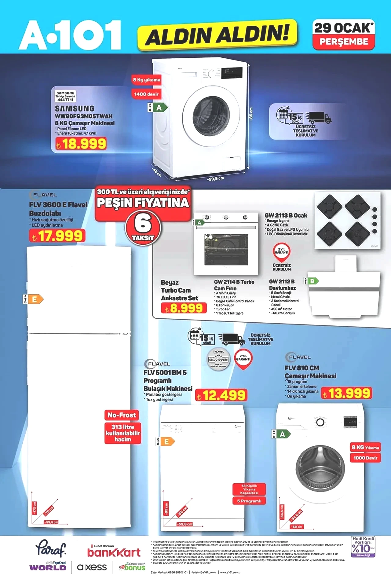 A101, 29 Ocak tarihli aktüel ürünler kataloğunu duyurdu. Bu hafta perşembe günü, A101 marketlerinde fırsatlar sunulacak. Bulaşık makinesi, buzdolabı ve çamaşır makinesinden oluşan 3’lü beyaz eşya seti raflardaki yerini alacak. 313 litre No-Frost buzdolabı peşin alımda 6 taksitle 17 bin 999 TL, 5 programlı bulaşık makinesi ise 12 bin 499 TL’den satışa sunulacak. 8 KG kapasiteli çamaşır makinesi fiyatı ise 13 bin 999 TL olarak belirlendi. Ayrıca, davlumbaz, fırın ve ocaktan oluşan 3’lü ankastre set de 8 bin 999 TL’ye A101 marketlerde tüketicilerin beğenisine sunulacak. Yaz tatilinin hazırlıklarına şimdiden başlayanlar için, 360 derece dönebilme özelliğine sahip 3 farklı boy valiz 839 TL ile 1.099 TL arasında fiyatlarla 29 Ocak aktüel kataloğunda yer aldı.