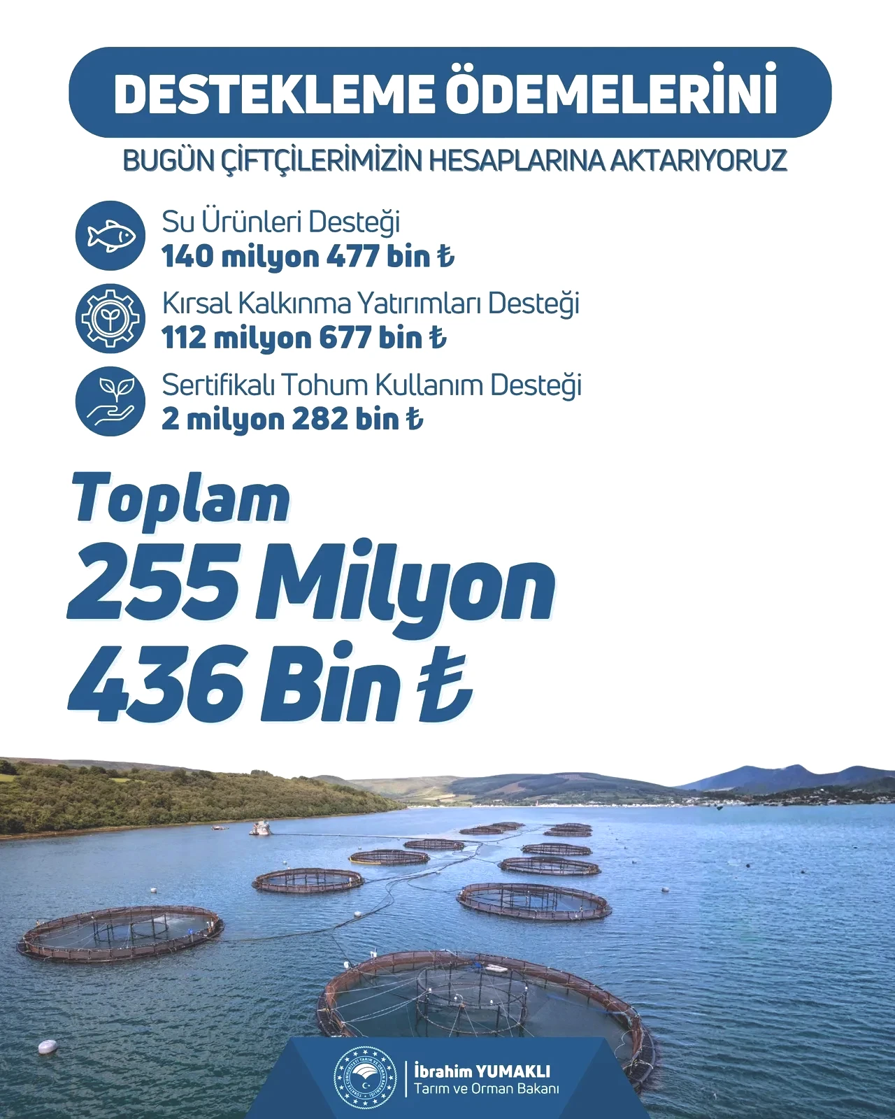 Paylaşımda verilen bilgilere göre, su ürünleri desteği için 140 milyon 477 bin lira, kırsal kalkınma yatırımları için 112 milyon 677 bin lira ve sertifikalı tohum kullanımı için ise 2 milyon 282 bin lira destekleme ödemesi yapılacağı belirtiliyor.