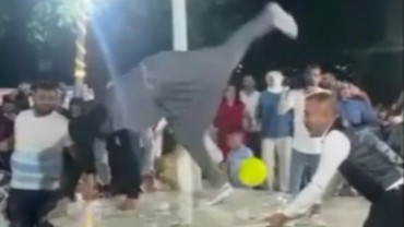 Elazığ’da sünnet düğününe katılan bir davulcu müziğin ritmine kendini kaptırarak akrobatik hareketler yaptı. Kendinden geçen davulcu, masanın üstünde takla attı, davulun üstünde yanan ateşi kafası ile söndürdü. Yere uzanıp ölü taklidi yapan davulcunun ilginç anlar cep telefonu kamerasına kaydedildi.
