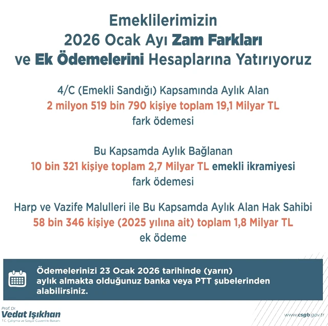 İşıkhan, sosyal medya platformu X'te yaptığı paylaşımda, "Emekli Sandığı kapsamında; emekli, malul, vazife malulü, dul veya yetim aylığı alan vatandaşlarımızın 2026 yılı için zam farkları ile harp ve vazife malullüğü aylığı alanların 2025 yılı ek ödemelerini yarın (23 Ocak Cuma günü) hesaplarına yatırıyoruz. Ülkemizin emektarları olan değerli emeklilerimize hayırlı olsun." ifadelerini kullandı.