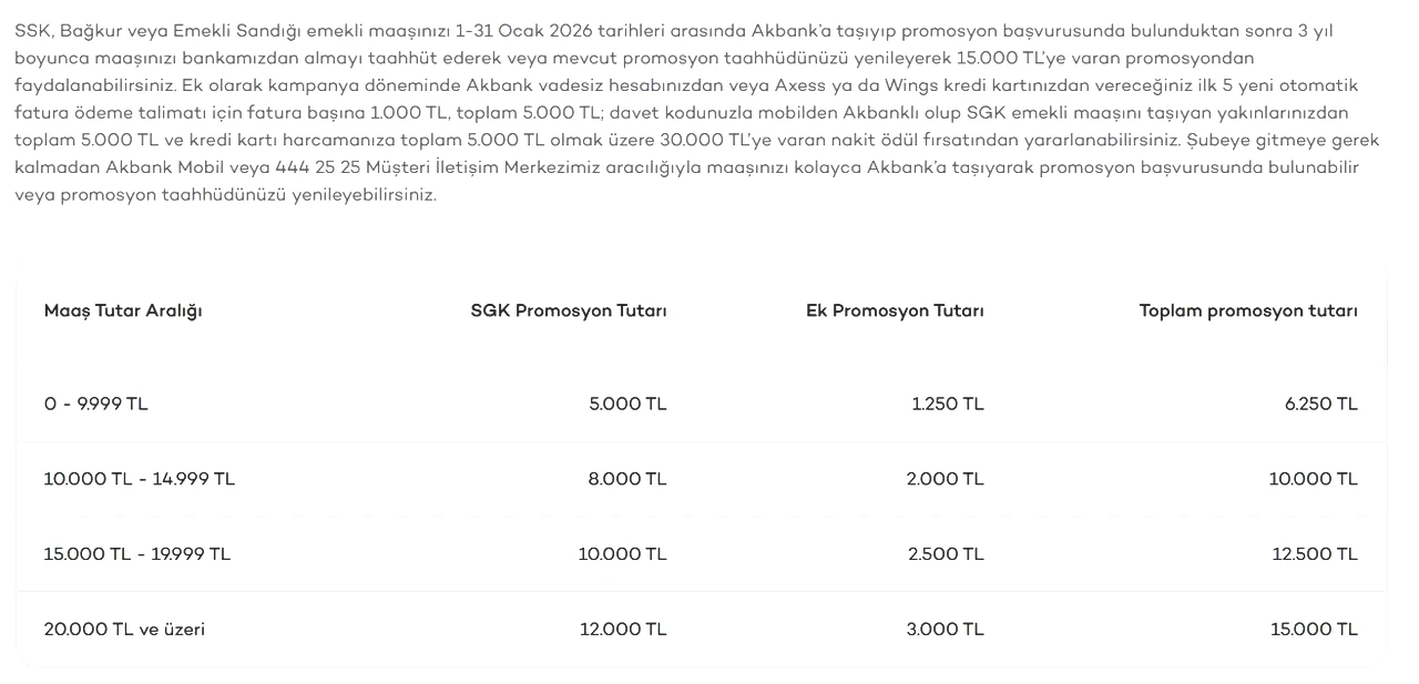 Akbank, emekli promosyon ödemeleri ile maaşını taşıyan veya taahhüdünü yenileyen bireylere 30 bin TL’ye kadar promosyon fırsatı sunmakta, ek olarak 15 bin TL’ye kadar ek promosyon ödenmektedir. Promosyon tutarları, maaş aralıklarına göre değişkenlik göstermektedir. Akbank’ın belirlediği promosyon ödemeleri ise şu şekildedir: