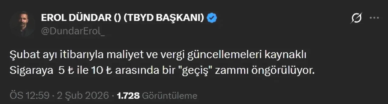 Yüksek vergi yüküyle dikkat çeken sigara ürünleri hakkında beklentiler, Tekel Bayileri Yardımlaşma Derneği Başkanı Erol Dündar tarafından sosyal medya hesabında duyuruldu. Dündar, açıklamasında "Şubat ayı itibariyle maliyetler ve vergi yenilikleri doğrultusunda sigaraya 5 ₺ ile 10 ₺ arasında bir “geçiş” zammının yapılmasının öngörüldüğünü" belirtti.
