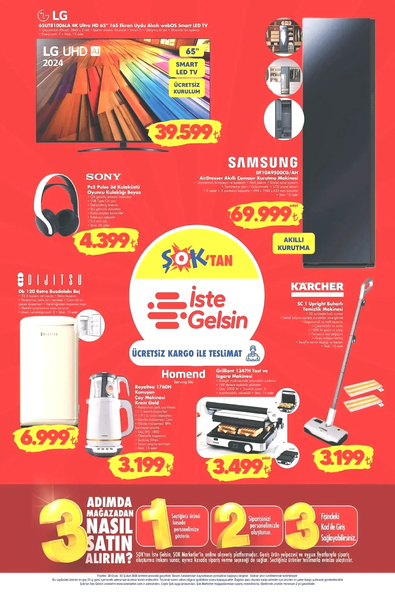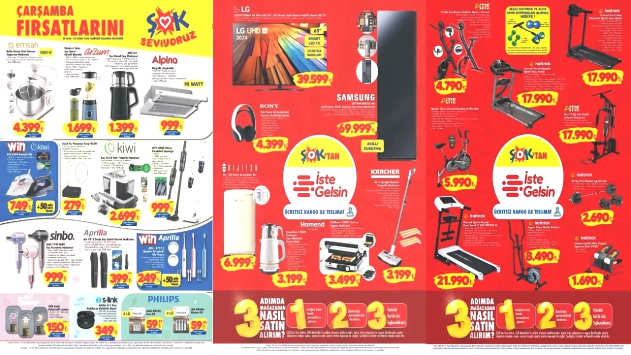ŞOK'ta bu haftanın indirimli ürünleri açıklandı. Müşteriler, elektronik mutfak gereçleri, temizlik ürünleri ve spor ekipmanlarında büyük fırsatlar bulacak. Pratik Kondisyon Bisikleti 4.790 TL'den, Eğimli Koşu Bandı 17.990 TL'den, Tek Kişilik Çalışma İstasyonu 17.990 TL'den, Dambıl Ağırlık Seti 2.690 TL'den, Eliptik Bisiklet 8.490 TL'den, Mini Stepper Egzersiz Aleti ise 1.690 TL'den satışa sunulacak. Teknoloji alanında, 4K Ultra HD 165 Ekran Televizyon 39.599 TL, Akıllı Çamaşır Kurutma Makinesi ise 69.999 TL fiyatla raflardaki yerini alacak. Retro Buzdolabı 6.999 TL, Konuşan Çay Makinesi 3.199 TL, Izgara ve Tost Makinesi 3.499 TL, Buharlı Temizlik Makinesi 3.199 TL olarak tüketicilere sunulacak. Banyo ürünleri arasında yer alan Çöp Kutusu 75 TL, Duş Başlığı Seti 169 TL, Deri Kulplu Kapaklı Kutu 149 TL'den satılacak. İki adet Banyo Paspas Seti 299 TL, Banyo Havlusu ise 179 TL'den raflarda yer alacak. İşte, ŞOK'un 28 Ocak - 3 Şubat tarihleri arasındaki aktüel kataloğu…