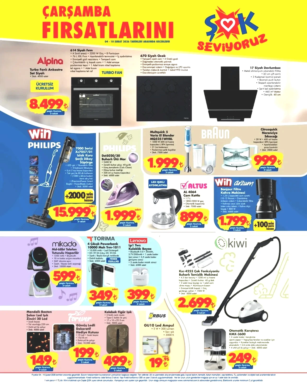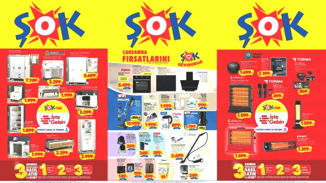 ŞOK marketinin 4-10 Şubat tarihleri arasındaki aktüel ürün kataloğu belli oldu. Her hafta çarşamba günleri gerçekleştirilen aktüel fırsatlarla dolu bu ürünler, zincirin bütün şubelerinde uygun fiyatlarla satışa sunuluyor. ŞOK marketlerin takipçileri tarafından merakla beklenen bu haftanın aktüel ürünlerini içeren 4-10 Şubat kataloğu yayımlandı. Bugünden itibaren ŞOK marketlerde yer alacak olan ürünler arasında çalışma masası, kitaplık, dört kapaklı dolap, bench puf, buharlı ütü, şarjlı dikey süpürge ve 10 bin mAh kapasiteli powerbank yer alıyor. Ayrıca, ankastre setlerini yenilemek isteyenler için fırın, ocak ve davlumbazdan oluşan ankastre seti, ücretsiz kurulum avantajıyla peşin fiyatına 3 taksit seçeneğiyle 8.499 TL'den sunulacak. İşte, ŞOK'un 4-10 Şubat aktüel kataloğu...