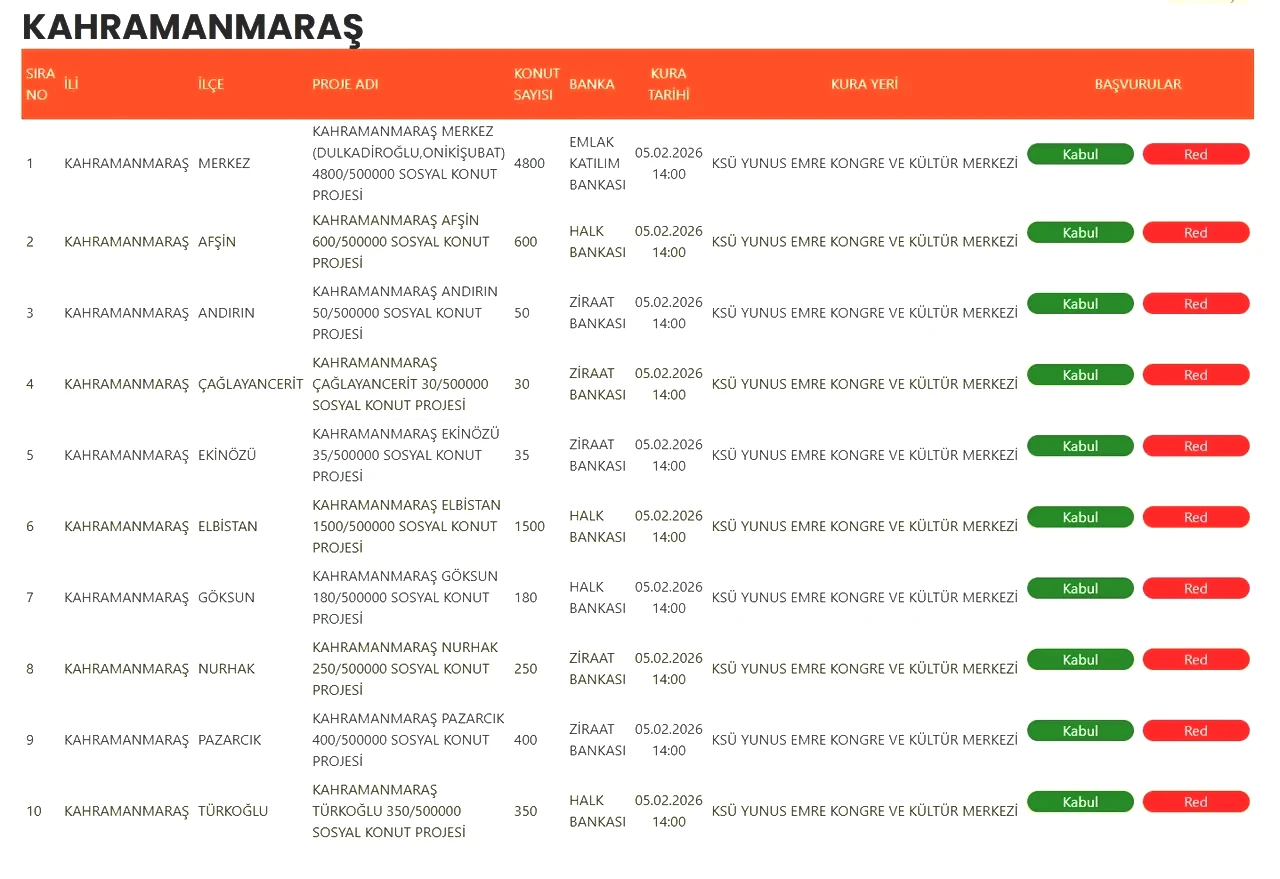 500 bin konut projesi çerçevesinde, 5-7 Şubat 2026 tarihlerinde Kahramanmaraş'ın yanı sıra Afyonkarahisar, Osmaniye, Yalova ve Kırıkkale gibi şehirlerde kura çekimi yapılacak. Kura takvimi ise aşağıdaki şekilde belirlenmiştir:
